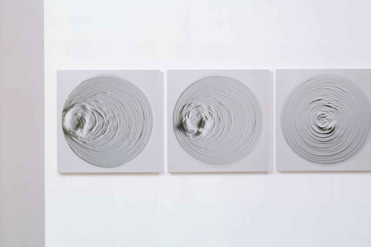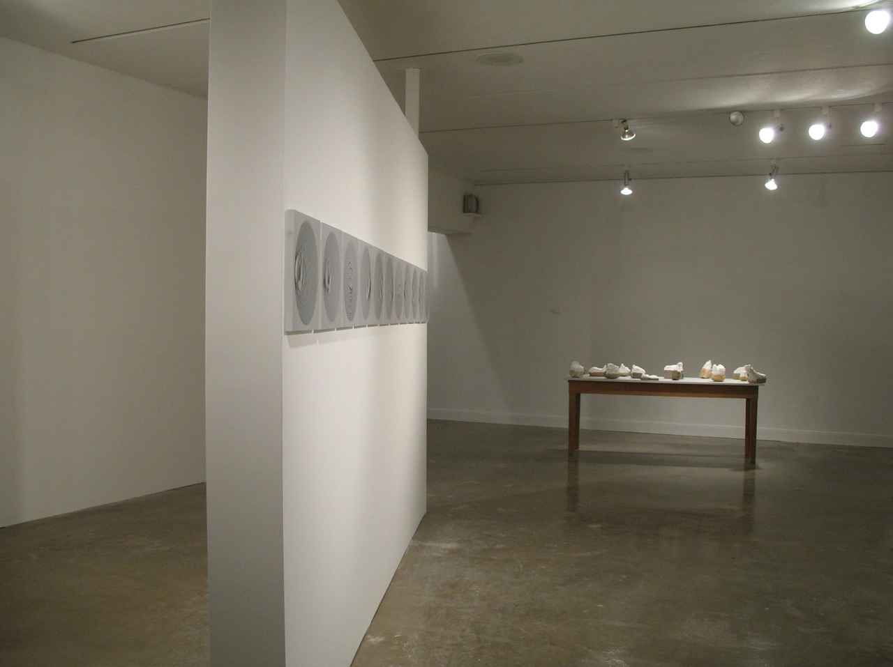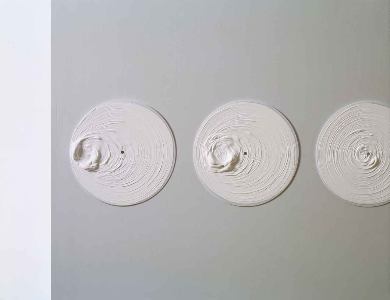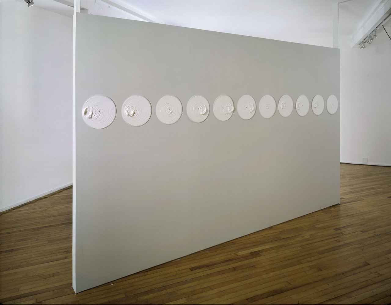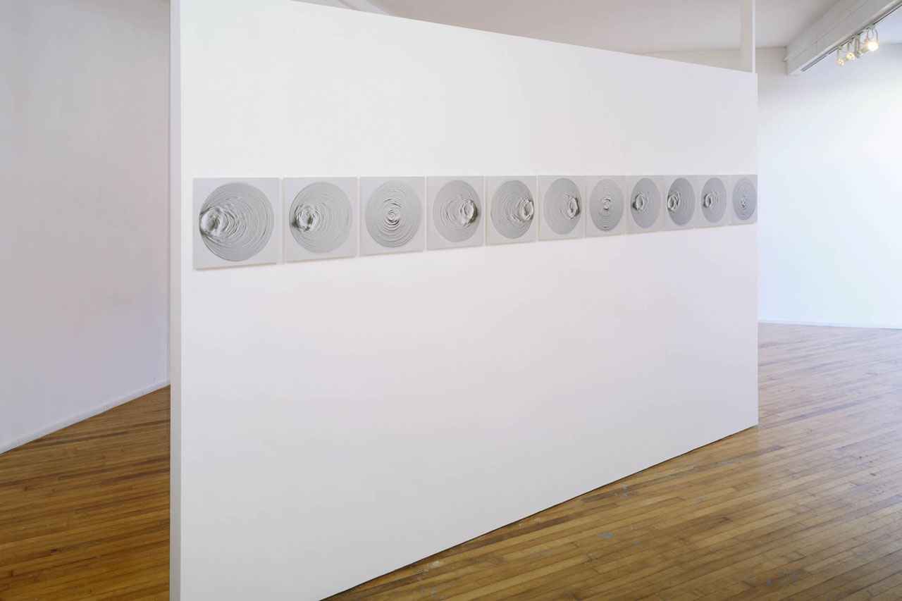The physical framework of circular panels is a wall constructed at a diagonal within the exhibition space. One side of the wall is painted a neutral, pale grey, upon which eleven circular, white Plexiglas panels, themselves painted with multiple gestures of white gesso, spread across from one end to the other. Each circular panel is screwed into the wall through its center—the fastener left visible to denote each panel’s geometric center and the imbalance among and within them, as the center of each gesture shifts from left to right on the x-axis. Studio photographs of the panels are mounted onto thick Plexiglas squares that hang directly on the opposing side of the freestanding wall. The photographs occupy an ambiguous space somewhere between product photography and fine art documentation.